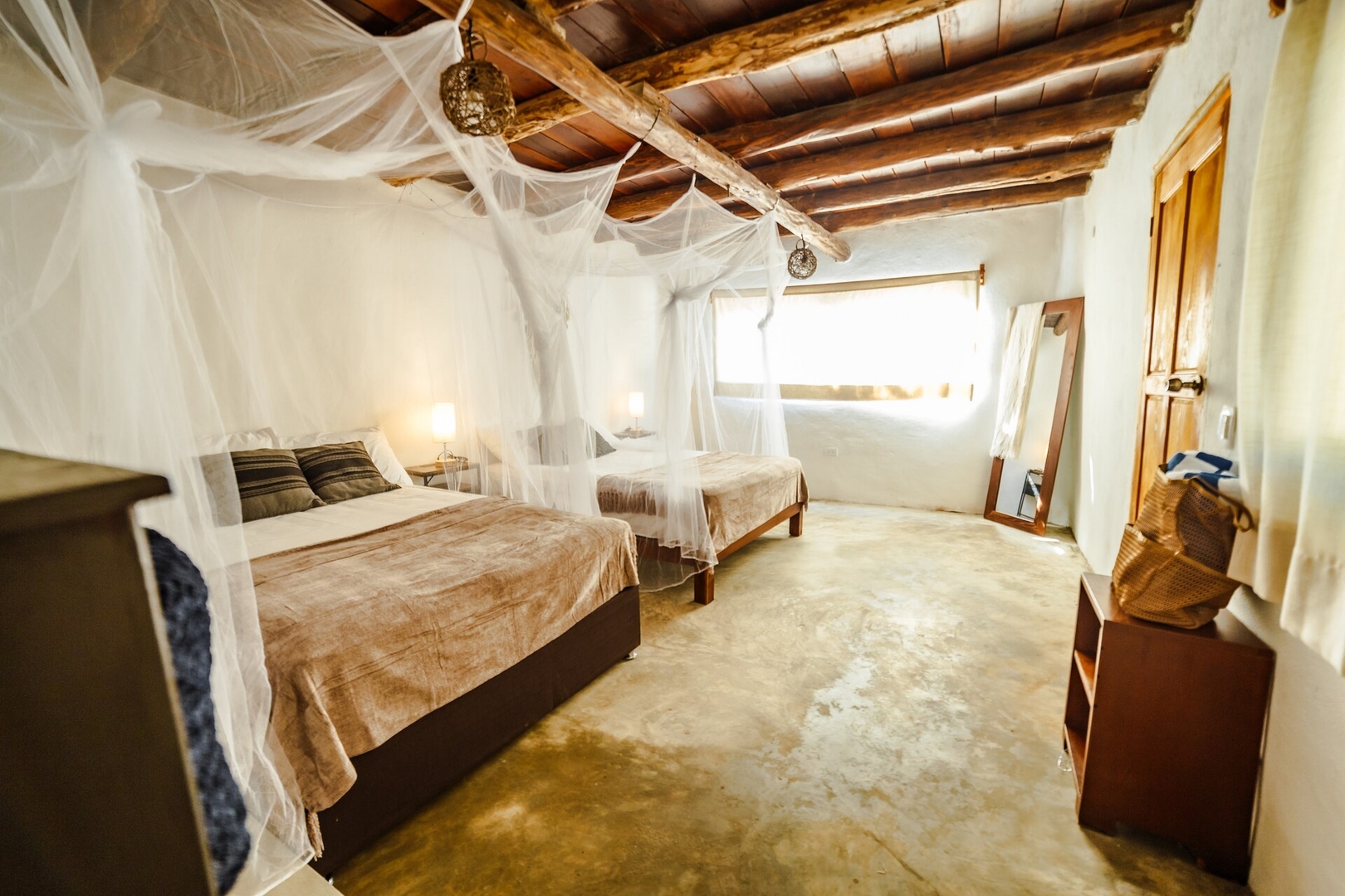 A 100 m del Caribe, Tau te invita a bajar el ritmo: cabaña Jungle-Boho de madera y luz en plena selva. Dormirás profundo en 2 camas Queen; ventiladores, baño privado con agua caliente y terraza con hamaca. Wi-Fi rápido y desayuno incluido. Playa de día; al atardecer, temazcal o yoga. Nuestro concierge gestiona traslados, renta de transporte y accesos a beach clubs. Proyecto eco con materiales locales y cámaras exteriores para tu seguridad. Reserva y reconecta.